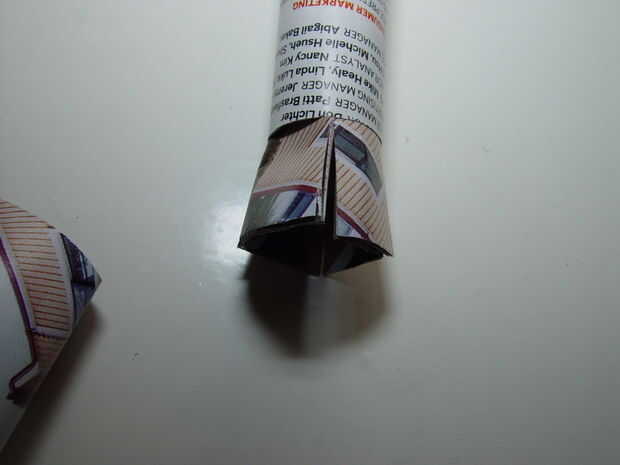 5. mantener el cono todavía dentro del primer tubo, corte cuatro ranuras longitudinales a lo largo de la parte del cono que sobresale. Las ranuras deberían alcanzar casi el tubo. Esto hará que cuatro aletas que usará para pegar el cono dentro del tubo. También puede pegar las capas de las aletas de uno al otro, pero no es absolutamente necesario.