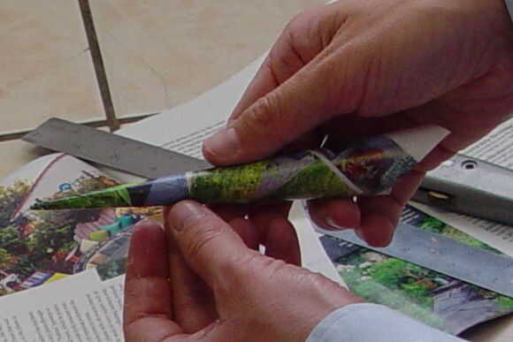 2. comience a rodar un cono, con punta en el centro del pliegue. Poner un dedo o dos dentro como su rollo y hacer la punta afilada. El cono será más de lo necesario.