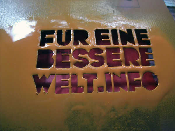 Ahora, utiliza el patrón de mi comodidad y aplica el "mensaje" (la URL de nuestro blog) sobre la base de color. Como se puede ver el texto de la etiqueta original brilla un poco más a través. Por lo tanto quizá quieras experimentar con colores más oscuros o con capas más de sólo dos colores.