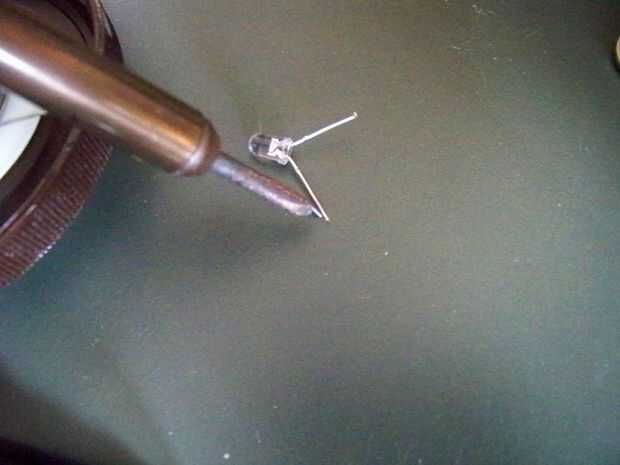 Está bien, lección sobre... En la foto 4, soldadura de los pines de lo LED para el soporte de la batería. ¿Recuerde que le dije a estañar los pines 1, así como la soldadura de la gota sobre los terminales del LED? Aquí es por qué otra vez. la gota de soldadura es por lo que puede calentar al cruce rápidamente, para no derretir el plástico. (agujero quemado, así como gases nocivos... Debería proporcionar una hoja MSDS con esto ahora?) No se muestra en detalle, miramos en la parte superior del soporte de la batería y se nota que pin va a los + (exterior) y - (contacto interno) de la batería... Más LED tiene el ánodo más largo que el cátodo. Si usted puede ver el cruce dentro del LED, (foto 4 por ejemplo) usted notará un "y /" la forma, la "Y", es el cátodo, el "/" es el ánodo, a una pequeña barba de gato (buena-Ay Caramba! ¿demuestro mi edad en electrónica de radio allí?) cable hacia el ánodo. simplemente la gota de soldadura en el LED lo suficiente como para derretir la soldadura del calor y que el fusible para el perno del soporte de batería. lo mismo para ambos lados! (-al cátodo + al ánodo)
