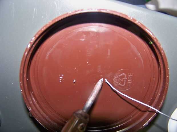 Añadir sólo una pequeña gota de soldadura a la "L", (Foto 1) Esto ayudará en el montaje del LED, con un daño mínimo a la tapa de plástico (recuerdas que te dije ¿explicar esto?) Sin embargo, en el montaje inicial, puse la soldadura en los pines de la batería después de meter a través... resultado: más agujeros... (y un conector flojo, Foto 2)