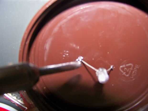 Ahora, para un poco electrónica básica... Un LED es un chip pequeño de dopado-arseniuro de galio, que genera luz visible (excepto infrarrojos LED, pero esa es otra historia), cuando la electricidad pasa a través de él. y dirigido, también actúa como un diodo, sólo permitiendo que la energía pase a través de él 1 dirección. de cátodo (K) al ánodo (A)... (K-| <-A) y a pesar de todo lo que has aprendido sobre electricidad, negativo, la tierra, es la fuente real y positivo, es la real. Energía pasa a través de un diodo del cátodo, conectado a negativo al ánodo, conectado al positivo. Más LED permitirá hasta 3 voltios para pasar a través de ellos, sin ser sobrecargado. (confía en mí, no ha vivido, hasta que he intentado conectar un LED rojo llano, a una fuente de alimentación de 12V... Con demasiado bajo un valor límite de la resistencia. * POP! *) LED blancos, sin embargo, parecen requerir un poco más de brío, por lo que una pila de litio 3V es mucho segura.