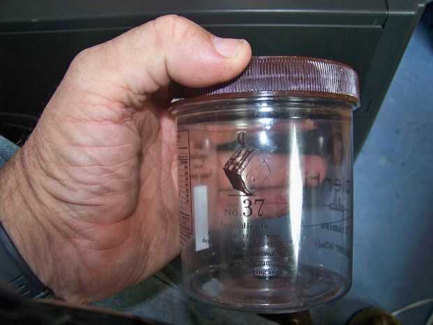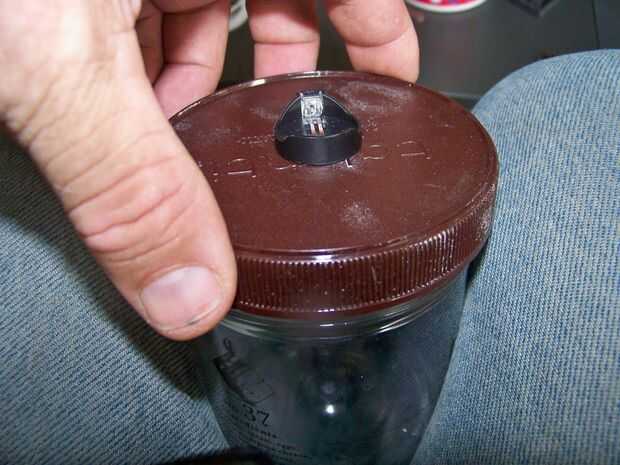 Ahora, una vez que el LED es soldado en su lugar, simplemente poner la tapa sobre la jarra. y, coloque la batería en el soporte... El LED debe encenderse inmediatamente! Si no, no te asustes! (y siempre traer tu toalla... Lo sentimos, momento de Douglas Adams hay..) Simplemente, extraiga la batería, abrir el frasco, desoldar el LED y las conexiones de intercambio. la foto 3 muestra una luz bastante débil (pila) pero te da una idea general... Depende del fabricante del LED y el fabricante de la batería, pero usted debe poder conseguir un par de horas de luz de una sola batería. Lo necesitaba solo para iluminar un armario de almacenamiento de información durante unos minutos más. Me imagino que éstos hacen para luces del partido de la novedad, luces de la tienda de camping, incluso simple llevar linternas para la noche.