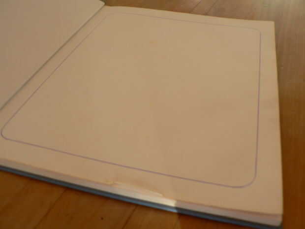 OK, esta es la parte que se pone un poco aburrida pero no tienes que hacerlo en una sola sentada (como estúpidamente lo hice). Colocar la cara del iPad en la primera página y traza alrededor de él. Usé una pluma porque un lápiz podría marcar el borde del iPad. Después de trazado, corte cuidadosamente la primera página. Una vez cortadas, puede rastrear la forma en la siguiente página o utilice el orificio guía. Puede hacerlo más fácil cortar las curvas con una cuchilla tipo xacto bien pero después de unas pocas páginas me cambié una pesada hoja de stanley para todo excepto las esquinas.
