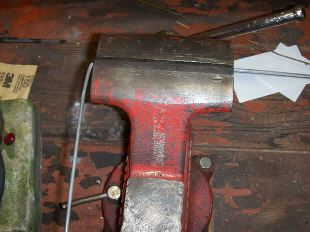 Coloque el cable en las mordazas de su vice, asegurándose de que a la línea de la marca a lo largo de su lado preferido de la flexión. Es más fácil para mí doblar a mi izquierda, por lo es Dónde está mi marca. Doble el cable 90 grados (la nueva pierna debe estar paralela a la otra pierna).