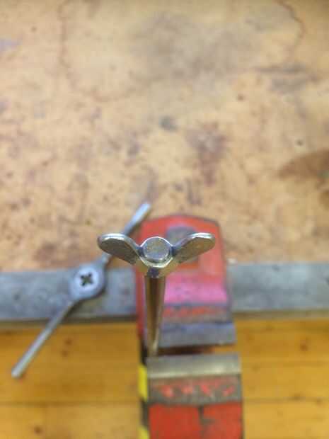 Oh no, las tiendas estaban cerradas y no tenía los tornillos de tamaño adecuados, así que hice mi propio. Después de hecho el tornillo-peldaño pegué el bold con el pegamento de epoxy de parte 2. Que pena tengo que esperar hasta que el pegamento se haya secado. Así en el momento que hice el bordado en el asiento.