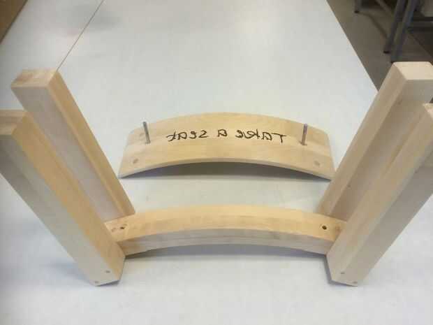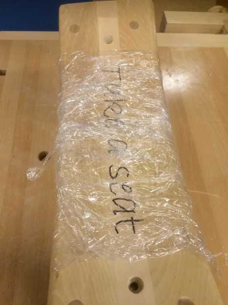Cubrir el bordado. Coloque el asiento sobre el riel de soporte. Aplicar los tornillos y apretar con las tuercas aladas. No olvidar las arandelas entre el riel de soporte y tuercas aladas. Añadir cola y clavijas en los agujeros en el asiento. Deje que el pegamento secando. Cortar la espiga y la arena suave. Aplique la cera una vez más en el asiento y el resto de las heces.