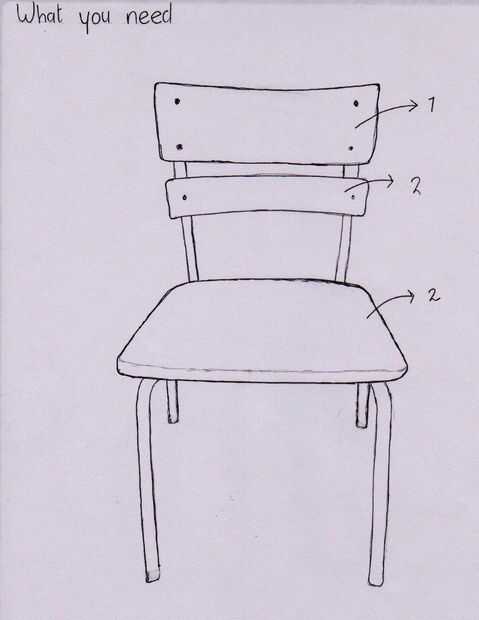 El asiento de mi materia fecal se compone de una espalda grande, el riel de soporte está hecho de dos pequeñas partes posterioras y dos asientos se convirtió en cuatro patas (ver dibujos). Si no encuentra una silla con dos partes posterioras también puede hacer su riel de soporte de otros materiales de descanso.