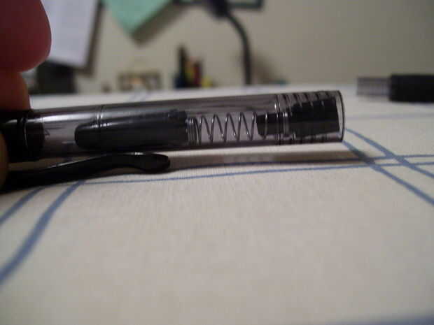 a continuación tendrá que tomar la parte larga, flaca y vuelva a colocarlo en el tubo primero. (Nota: utiliza la parte más larga del tubo, no el uno con el agarre). debe sobresalir el extremo y casi como haría normalmente. A continuación, poner en la primavera, seguido por el pedazo corto, gordo que salió primero cuando usted tomó aparte. Ahora, toma el cartucho de tinta y empuje hacia abajo en él hasta que hace clic y no debe regresar. ahora se cargan.