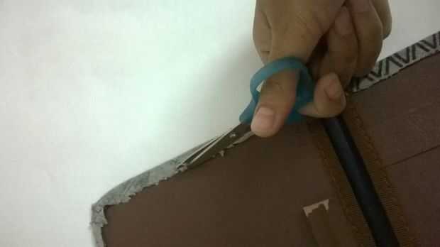 Tomé el archivo portada (con bolsillo interior) y corte a mi tela, un poco más grande que la tapa del archivo. Voy a utilizar a esta tela para cubrir mi archivo de portada. Primero aplica pegamento en la parte exterior del archivo y pegar a la tela. Luego aplica pegamento en el interior del archivo (sólo en los bordes esta vez) y pegar a la tela restante. Siempre puede cortar a cualquier tela exceso después de que se han pegado en el archivo.