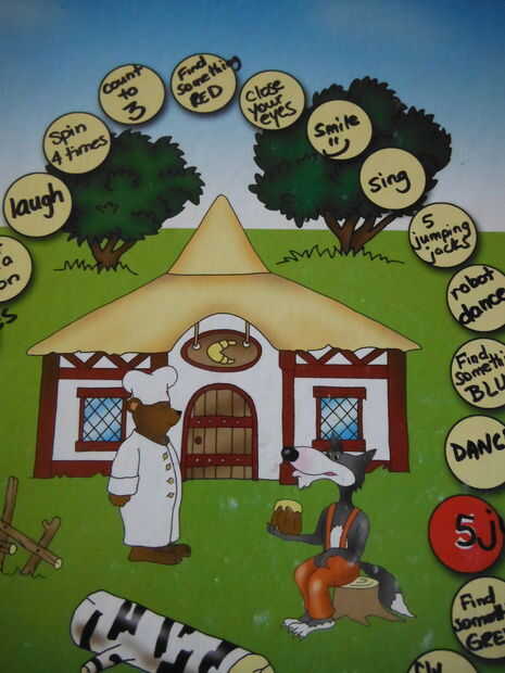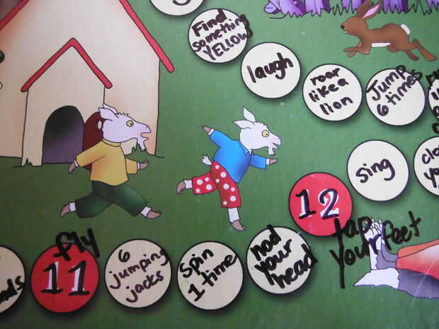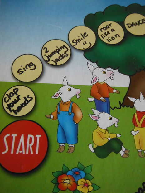 Lo que ella hizo fue simplemente escribir un montón de diferentes acciones para los niños que cuando aterrizaron en cualquier plaza particular. Esta manera, los niños tienen que leer lo que necesitan hacer y luego realizar la acción asociada. Algunos ejemplos de acciones que ella escribió en la pizarra: "Rugido como un león", "Dance", "Aplauda sus manos", "Risa", "Sing", etc..