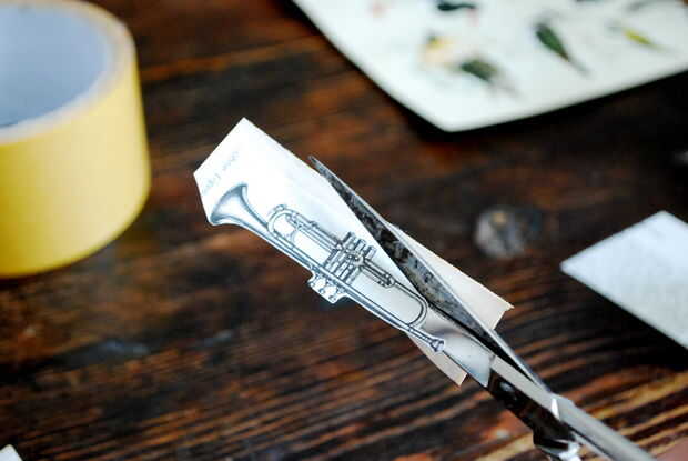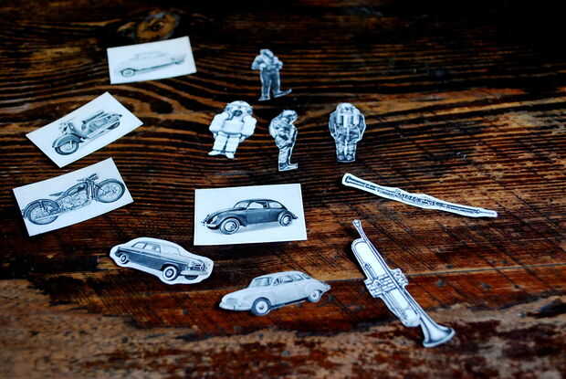 Solo se pegan las fotos para el lado adhesivo de la cinta y cortar cortar la forma de la imagen.