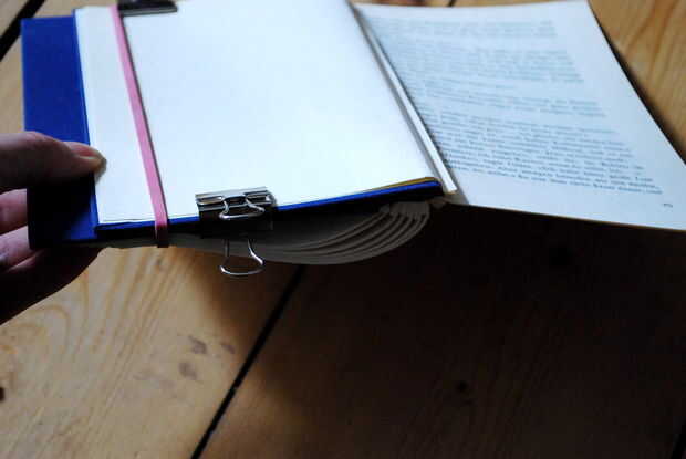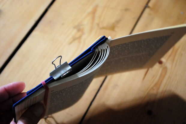 Recomiendo el clip a la cubierta del libro y todas las otras páginas para hacer más fácil coser. Echa un vistazo a las fotos para ver lo que me refiero...