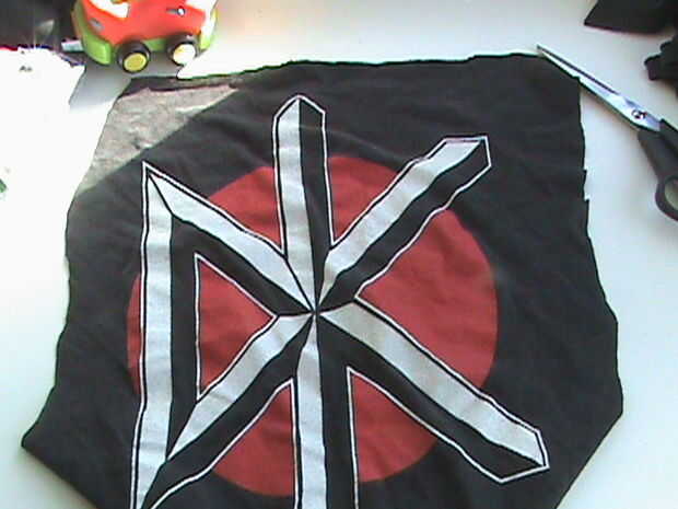 Fue el intestino desgarrador parte. Odiaba a cortar encima de esta camisa, me había servido a través de muchas noches, incluso utilizarlo para detener mi frente de sangrado cuando casé le dio un codazo en un espectáculo. De todos modos, solo recorta la imagen, símbolo, qué has. No intente cortar perfectamente recta ya que pliega bajo cuando esté cosiendo.