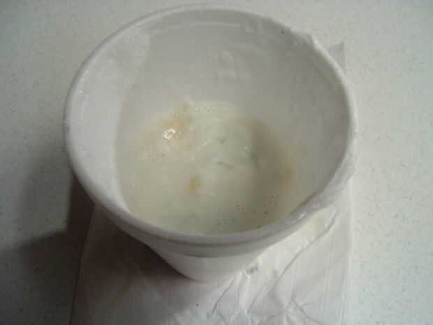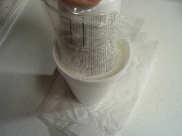 Después has microwaved el jabón hasta que el agua se levanta fuera de la taza, quitar del microondas y ponerlo en algún lugar. Puede utilizar este tiempo para encontrar algo que tiene el mismo diámetro que la mitad de la taza y una bolsa de sándwich o bolsa de ziploc. Ponga el objeto en la bolsa, (utilicé una botella de vitamina) e introdúzcalo en el jabón para que sea más densa.