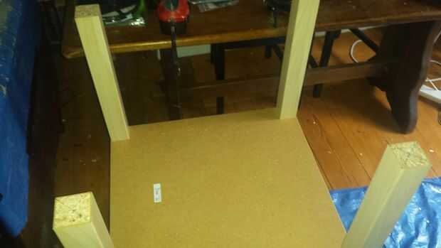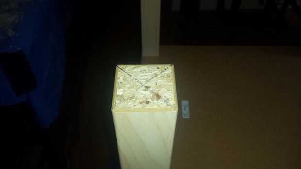 Desea perforar lo agujeros fuera del centro en la parte inferior de las piernas, como cuando se trata de perforar los agujeros en la parte superior de la otra mesa, hay un tornillo de metal que se utiliza para sujetar la tapa de tabla a la pierna. Una vez que haya perforado los agujeros en la parte inferior de las piernas, use estos agujeros como guía para perforar en la parte superior de la otra mesa.