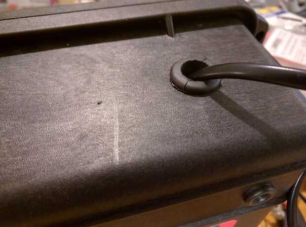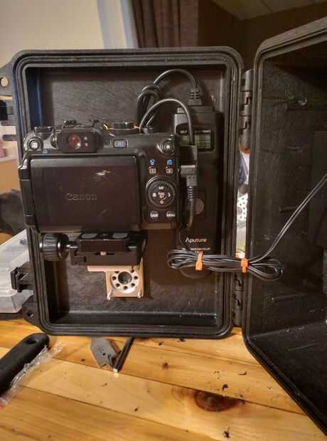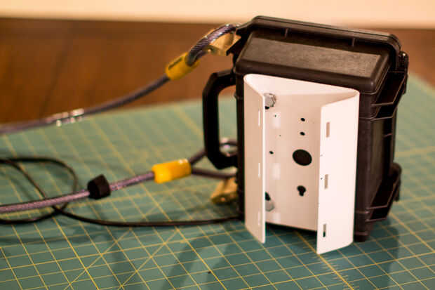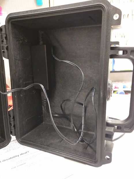 Ya tengo un adaptador de CA para la G11 de Canon, y va a instalar una toma de corriente del poste a que este caso se colocará. Taladrar un orificio de 1/2" en la parte inferior para alimentar el cable de alimentación al adaptador y utiliza un ojal para acabar. El poste Vertical montaje me permiten asegurar el recinto a un poste de teléfono en el lugar de trabajo y las cerraduras y cable hará difícil para alguien que simplemente caminar con el caso. Lo menos disuadirá a nadie sin una herramienta de bloqueo.