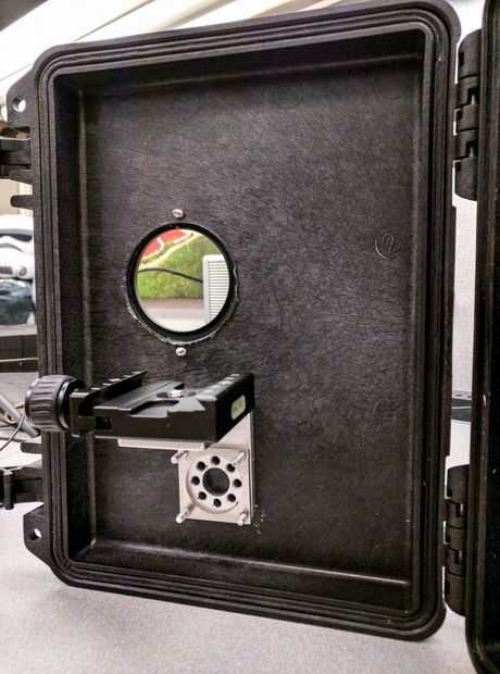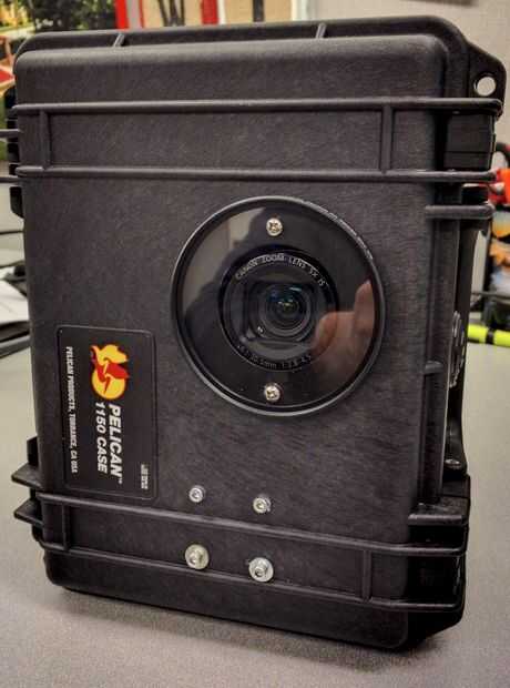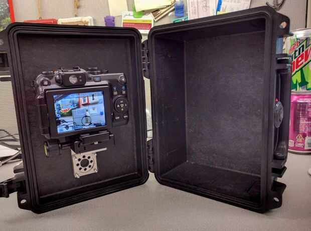 Con un caso de Pelican 1150 para mantener la cámara seca y segura, hay un montón de espacio interior para el adaptador de CA y intervelometer. Me corte un orificio en el frente de la caja y utiliza un paso adelante anillo adaptador para montar en la parte delantera de la caja para guardar un filtro UV y proteger la cámara y en el caso. La cámara está montada en una placa del arca swiss acoplado a un soporte en "L" de Actobotics. Este montaje interno permite que la cámara a colocarse de tal forma que la lente extrae casi al ras del cristal del filtro UV. El parasol simplemente da el vidrio ultravioleta una pequeña protección contra los elementos. Se llevar un paño cada vez que vaya a obtener imágenes de la cámara y limpiar cualquier cosa sobre el vidrio. El plan es montar físicamente el caso para el poste de teléfonos de sitio de trabajo usando un montaje del poste vertical, que se fija a la caja pelican con pernos. El soporte se fija al poste con ataduras de cremallera o correas de la raqueta de aluminio con un destornillador. Esto hará que sea permanente, y cerraduras se añadirá a la caja junto con el cable de seguridad para impedir robos. He visto otros proyectos que utilizan baterías de coche o un inversor, pero voy a tener alimentación en el poste para no tener que preocuparse.