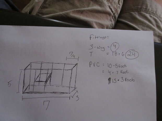 Empezar por decidir cuánto espacio tienes en el patio y cuántas sus gatos se van a querer. Tenga en cuenta que la tubería es barata y accesorios de lujo como las uniones de tres vías son lo que se acumula. Elegí mi dimensiones 7 X 5 X 3, porque mis gatos les encanta subir y la longitud y la anchura facilitaron tres niveles de plataformas que cabrían en la sombra.