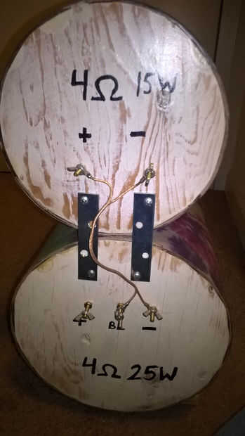 Cableado: Marque las tapas exteriores con la polaridad de los cables. Luego, con cable grueso y soldadura para las zapatas en los pernos de latón. Debe ser la longitud del tubo, más 8". Ahora, instale el perno y sellarlas. Usé el epoxi en el interior. Había atornillado desde el exterior y utilizar tornillos para fijar los cables externos. Por último, soldar el otro extremo del cable a los altavoces.