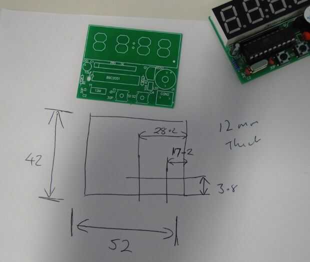 Las medidas principales que se necesita son del tamaño de la PCB y el espacio de los botones de los laterales e inferiores. Tengo unas medidas bastante extraño como obviamente fue dibujado en pulgadas, sería fácil dibujar el cuadro en pulgadas, pero como vivo en un país de métricas y mi programa de CAD se establece en métrica y probablemente confundirían algunos de mis alumnos, he pegado sólo con el sistema métrico.
