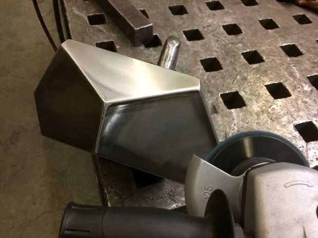 Comencé usando un disco de grano 80 flapwheel en la amoladora angular para pulir las soldaduras. Si tuviera una soldadura particularmente desordenada o irregular, cambió el disco para un disco de flapwheel de grano 40 eliminar material de forma un poco más agresiva. Si la pieza tiene un lado abierto, asegúrese de lijar suavemente por el borde para que sea suave al tacto.