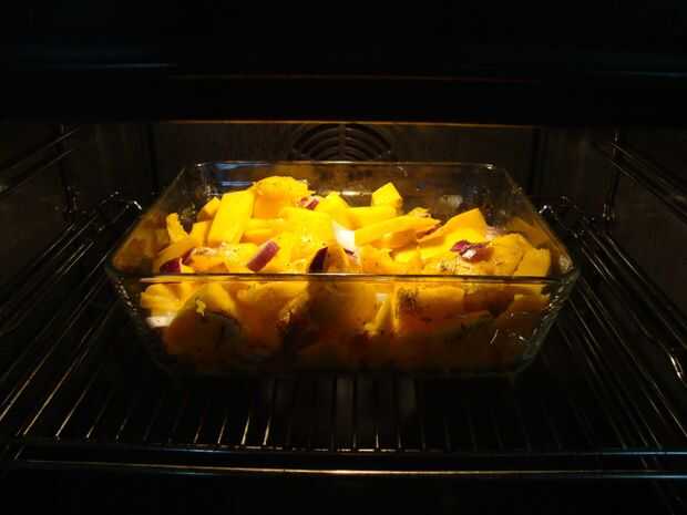 Poner la bandeja en el horno a 200° C durante al menos 30 minutos. Tomar una copa, sentarse y tomar un breve descanso. Una vez cada 10 minutos revolvió un poco en la bandeja para obtener algunas otras piezas en la parte superior. Cuando comienzan los últimos 10 minutos, pasar al paso siguiente.