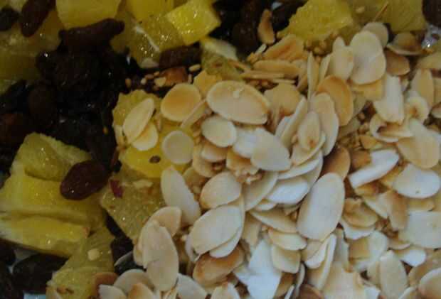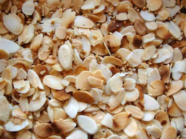 En primer lugar, asar las hojuelas de almendra y ajonjolí. Se añade un agradable sabor asado y morder a su plato, pero más importante, también algunos vitamina B, vitamina E y minerales esenciales como calcio, hierro, magnesio, manganeso, fósforo y zinc. Poner una sartén a fuego alto y cuando está caliente, echar las semillas y escamas. Se tarda sólo unos pocos momentos antes de oler los aromas agradables y ver los colores cambiantes. Si eso sucede, se echan en el recipiente grande que utilizaremos más adelante para mezclar todo.