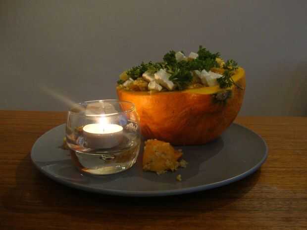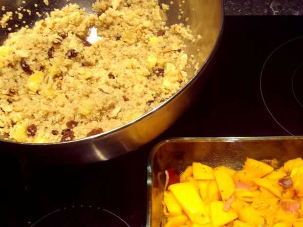 Comience agregando la naranja, pasas y almendras tostadas y semillas de sésamo a la quinua. A continuación, tomar las piezas de la calabaza del horno y añadir a la mezcla de quinoa. Personalmente como el aceite de oliva con sabor que queda en la parte inferior de la bandeja y añadir que así. Esto hace que el plato un poco menos sano, pero le da mucho más gusto. Mezcle suavemente y sirva en el recipiente de calabaza.