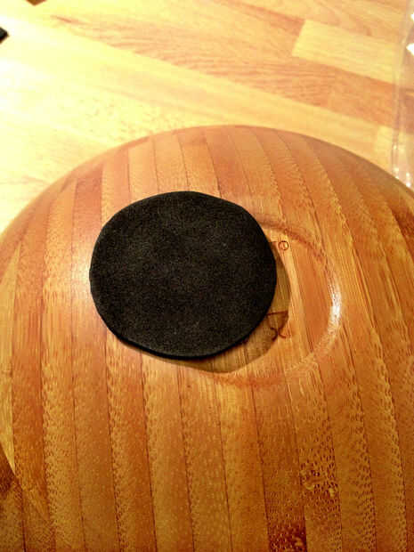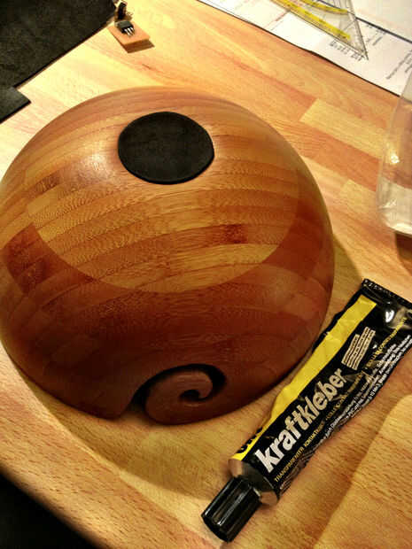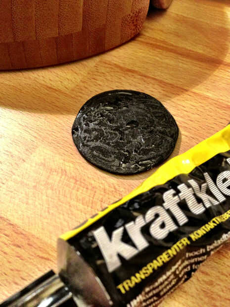 Para asegurar que el recipiente no está cambiando en la mesa de madera, pegué una pieza redonda de goma en la parte inferior del recipiente.