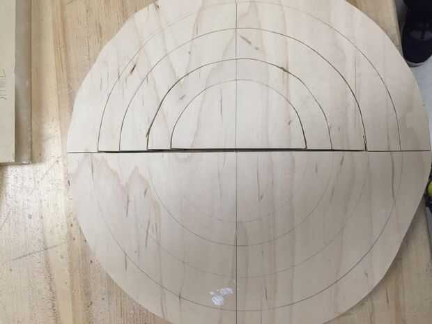 Cortar la madera por la mitad hacia abajo de la línea central del círculo y cortar los anillos en un ángulo de 45 grados