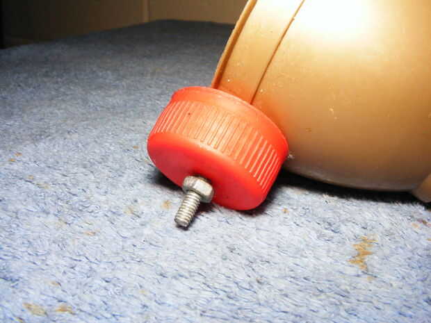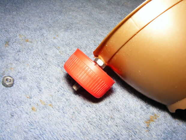 Mismo tipo de procedimiento como el tazón de fuente - perfore un pequeño agujero en el centro de la tapa de la botella de soda, o utilice un destornillador para masticar el plástico. Empuje en el perno con la parte superior de la tapa hacia el recipiente. Prueba del hilo de rosca la última tuerca en el perno.
