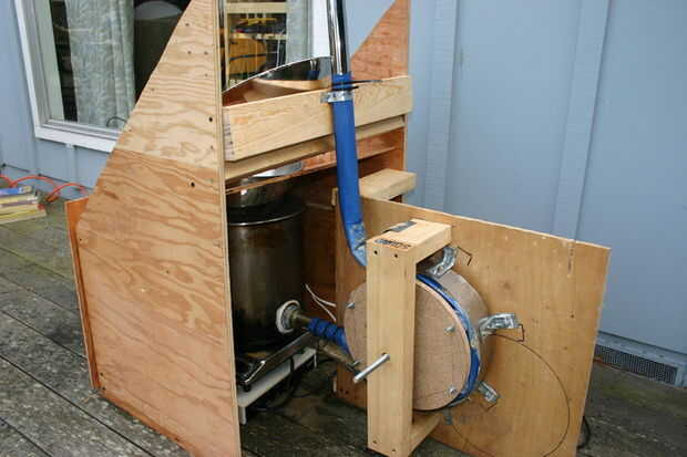 manguera para lavabo estándar plubing. una caja de madera contrachapada escondió la placa caliente y resivour y