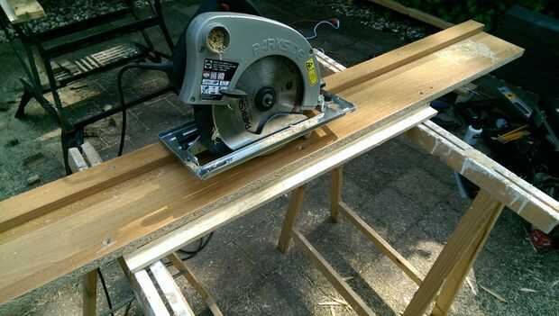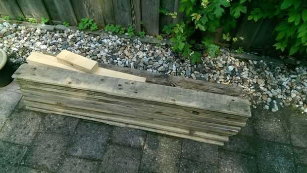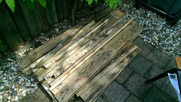 Esta tabla se hace de 3 vigas y madera reciclada de palets. Las vigas y plataformas que obtuve de un contenedor de basura que estaba parado al lado de un edificio que estaba siendo renovado. Las plataformas donde un tratamiento térmico euro-palets en total tenía 66 juntas en 3 tamaños pero no todas las placas donde utilizable. Todos los tornillos usé donde de mi caja de sobrante (tornillos y tuercas y tornillos he sobrado de otros proyectos, que lanzo en 2 cajas).