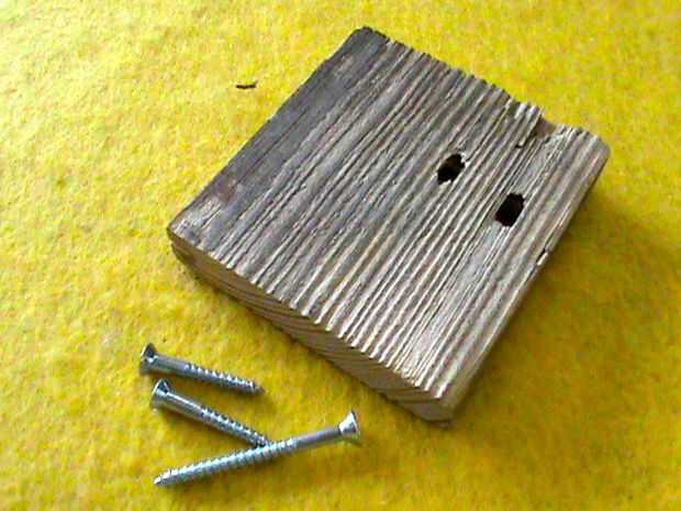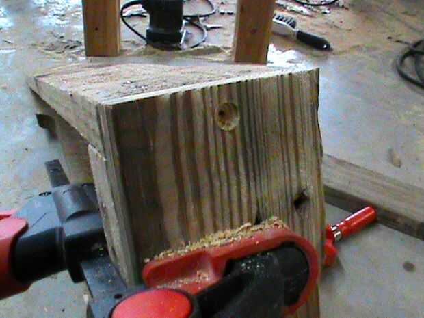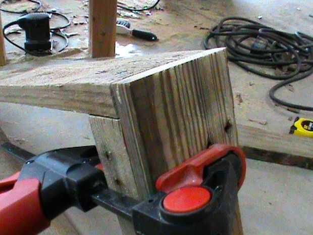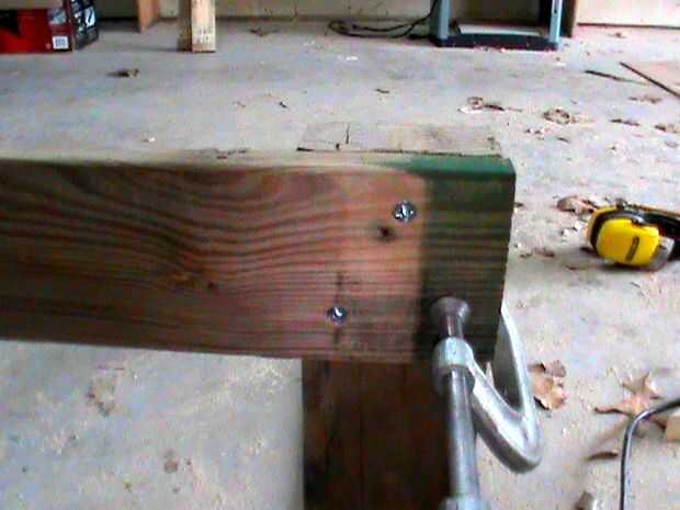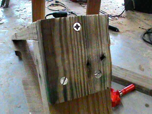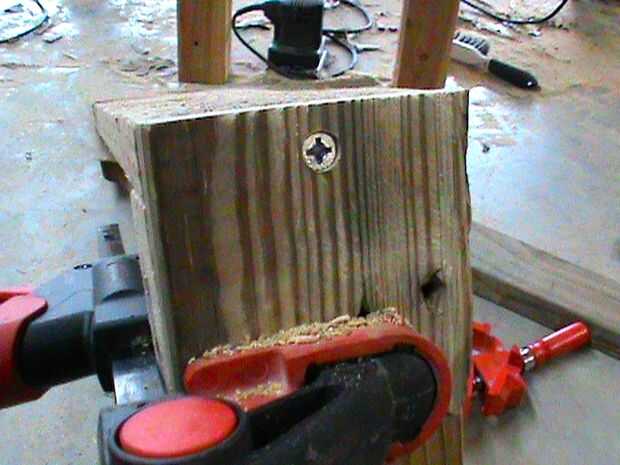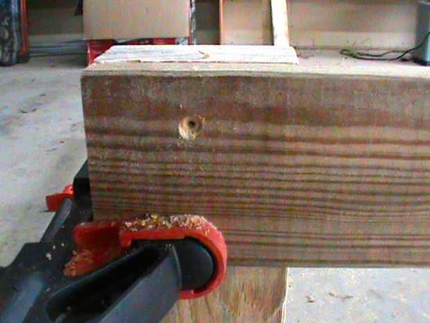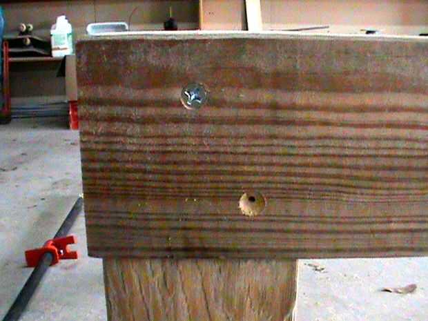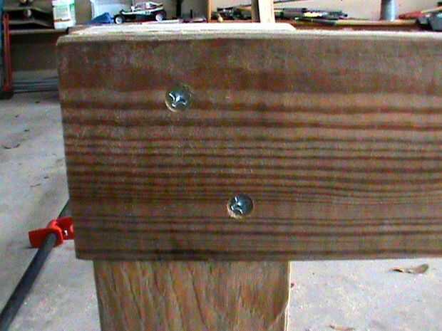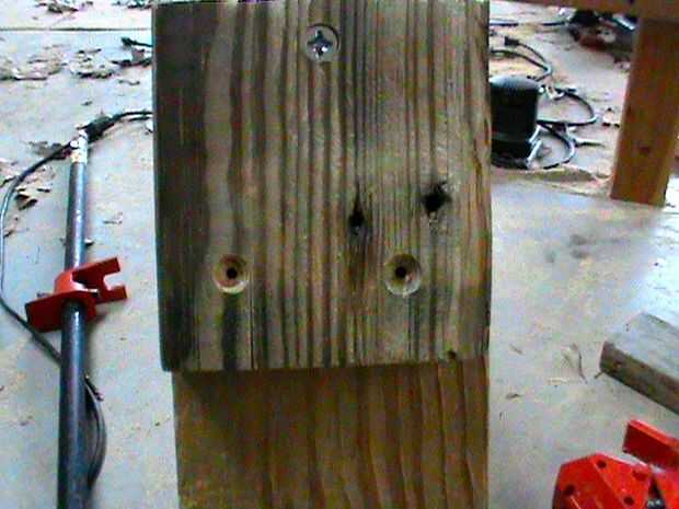 Fotos 5 y 6 - Retire la abrazadera de taladrar dos orificios piloto y enrosque dos tornillos de 1 1/4". Repita el proceso para el otro.