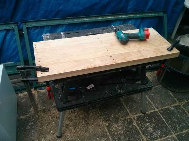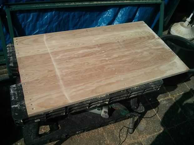 Después de que las plantillas se realizaban conectando, pegado y fijación de los tableros fue fácil y sencillo. Yo tenía total 6 tableros, así hizo 3 series de 2, afianzado con abrazadera y pegado, esperado para que el pegamento se seque, entonces había conectado el conjunto. Cuando estaban conectadas todas las 6 placas I lijar toda la cosa y tenía un aspecto impresionante de la losa.