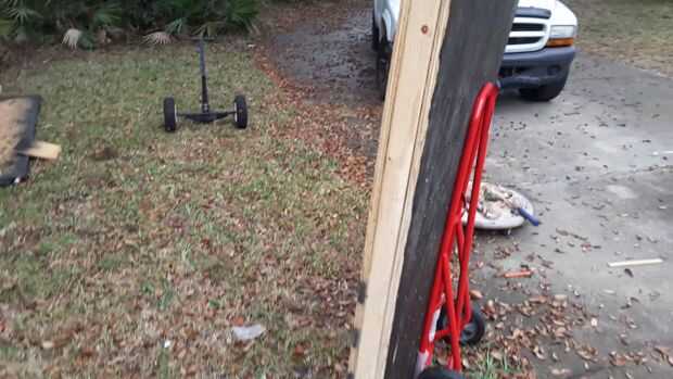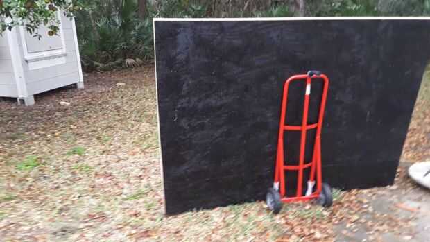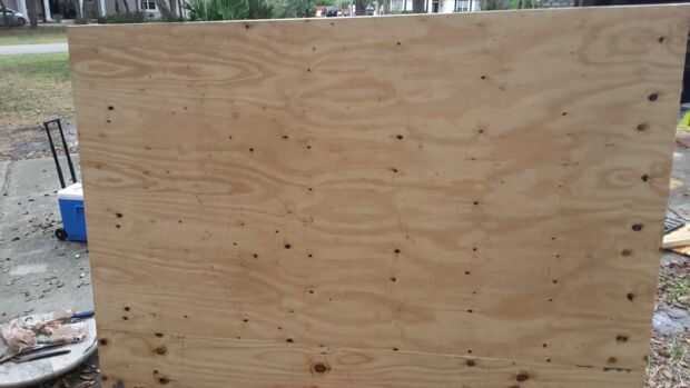 Luego coloque la madera contrachapada (1/4 de pulgada es fino) en la parte superior. Necesitas 3 hojas de 4 x 8, viendo como nuestra Fundación será de 5 x 7 y tendrá un 1 pie por espacio de 7 pies sobrante. En este punto puede tomar la base de su marco. Puedes agregar algunas vigas transversales en el marco por lo que puede clavar las piezas pequeñas de madera directamente en un poste. Una vez hecho esto, puedes marcar donde las vigas están en el lado de la madera contrachapada, para fijar la base a la subida de remolque más fácil durante el siguiente paso.