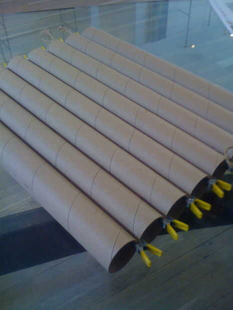 hice este estante de tubos de cartón gruesos en 2002.he encontrado los tubos en la basura, de los pernos de la tela. tal vez pregunte una tienda de tejido local si tienen alguno. Yo vivía en los Ángeles, si vives allí, usted puede encontrar cargas de