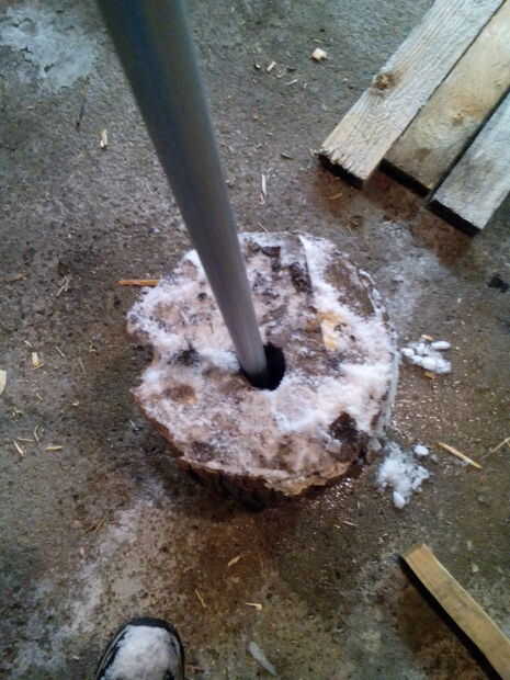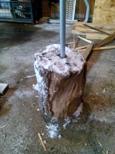 El único costo incurrido para este proyecto fue $3,00 digno de 3/4 redonda 5' pedazo largo del conducto. Este será nuestro "tronco" de la que construimos las "ramas" alrededor. Como base, que allanaron mi pila de registro atrás y encontré el muñón ideal, que del que ya tenía un agujero en el centro. Inserta el Polo hasta el fondo y golpeado una cuña de listón en junto a enderezar y sujetar el poste del conducto en su lugar.