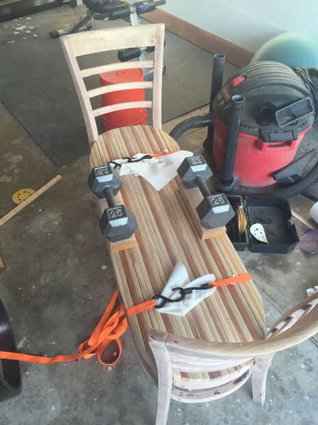 - Una vez las placas de asiento de centro, pegar la parte delantera y los bordes de nuevo. Utilice correas de trincar a aprete los directorios y añadir algo de peso encima de ellos.