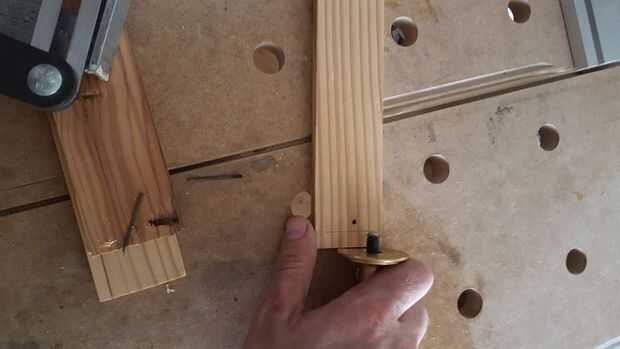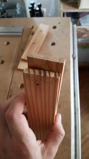 Controlar el espesor de la culata y marque en los lados de la pieza de acoplamiento. Luego ajustar el ángulo de un calibrador de biselado y marcado de los pernos (estoy cortando las colas en primer lugar, por lo que los pines marcados para eliminarse)