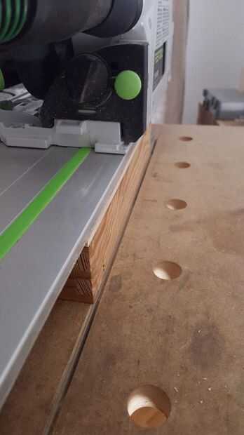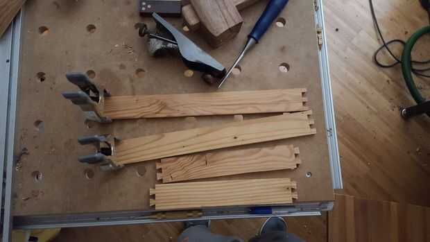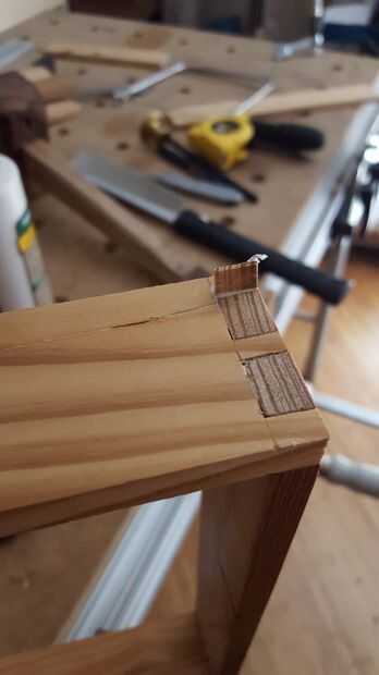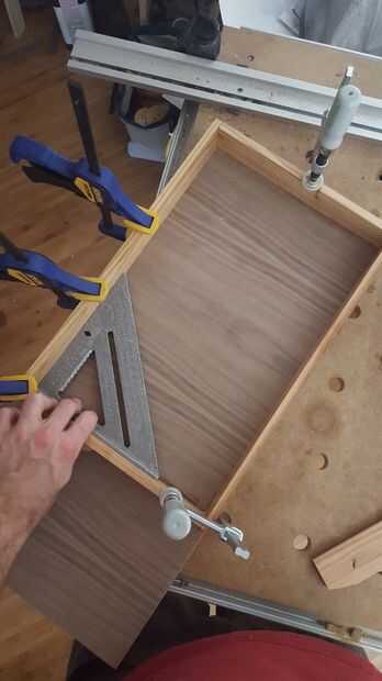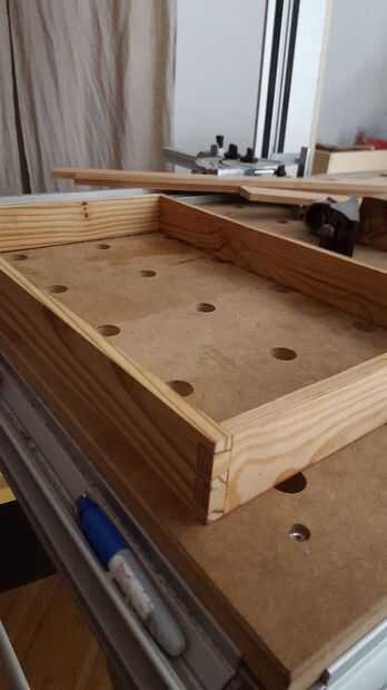 Con el corte de colas de Milano, el marco puede ser pegado juntos. Mis dientes estaban bien, pero para hacer les mirada impecable, inserte una cuña en los huecos. Luego pegué sobre un trozo grande de madera contrachapada para la parte inferior, asegurándose de que el marco cuadrado. Una vez seco el pegamento, utilicé una sierra de pista para recortar la base a ras con el marco.