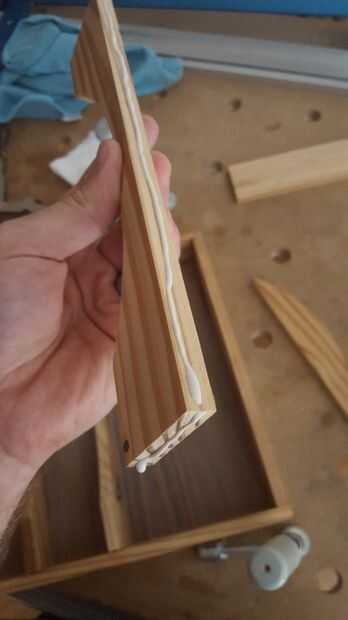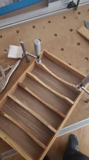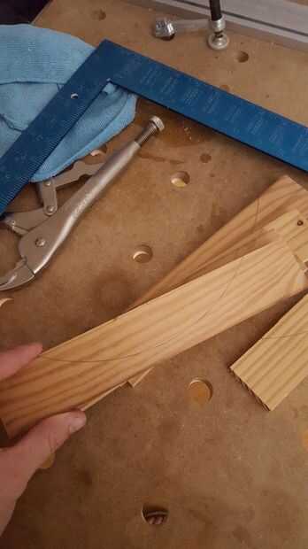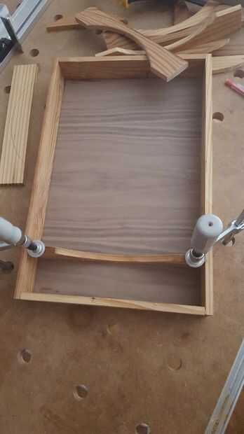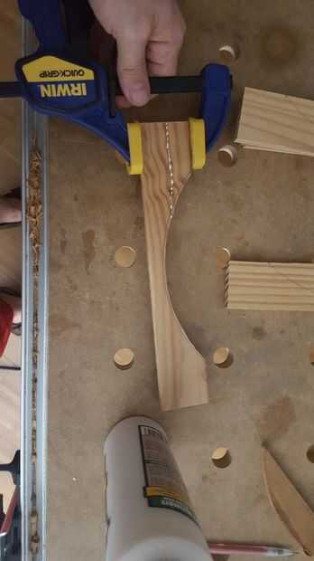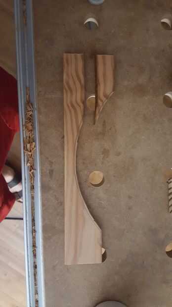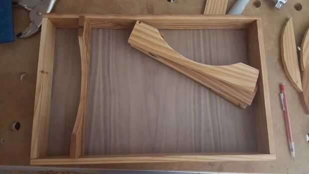 Marcar el stock a la profundidad de la estructura y corte a la longitud. Luego utiliza un plato para marcar una curva en los divisores y utiliza la Sierra de marquetería para cortar la curva. Uno de los divisores partirse mientras se está cortando, pero era una rotura limpia y fácilmente podría ser pegado juntos. Luego lija en la curva y había pegado los divisores en el lugar.