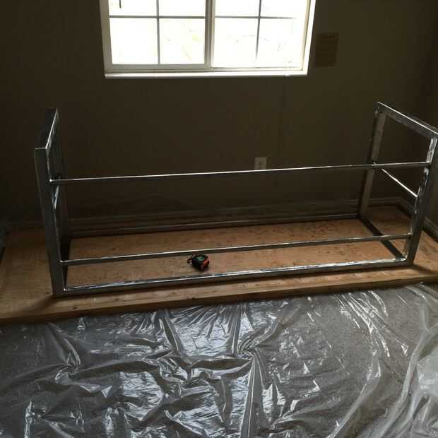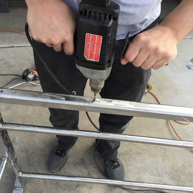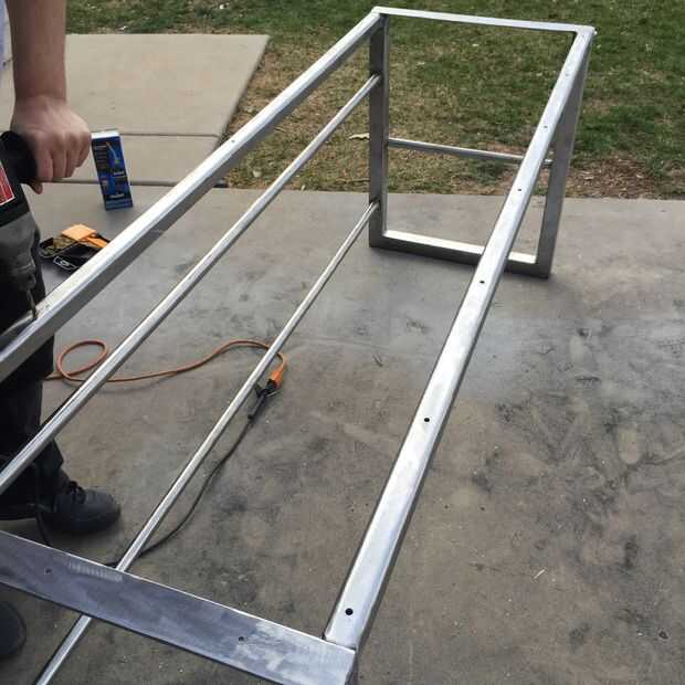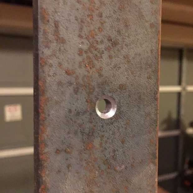 Para fijar la base, primero necesita perforar agujeros para los tornillos. Los orificios perforados las 2 pulgadas cuadrada tubo y barra plana y avellanado el agujero inferior, para que el escritorio puede ser atornillado sobre de debajo y los tornillos se sentará al ras en el metal sin enganche en nada.