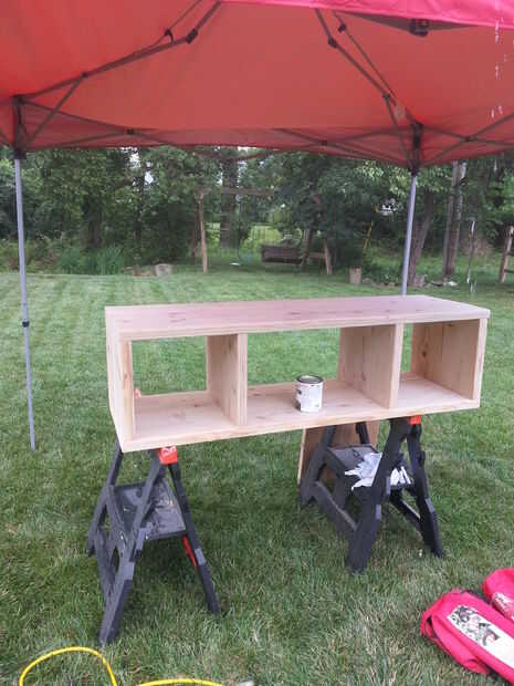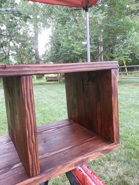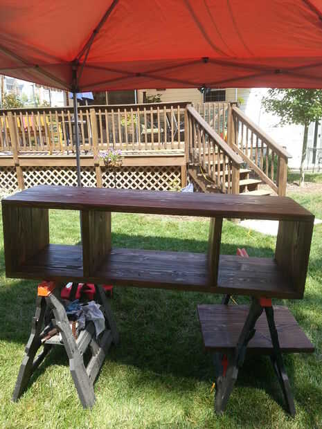 Luego teñir la madera con su opción de tinta para madera, decidí ir con una mancha de nogal oscuro. Yo uso un cepillo de espuma de 3" para limpiar la mancha en y limpie cualquier mancha adicional de apilamiento con el trapo de un pintor.