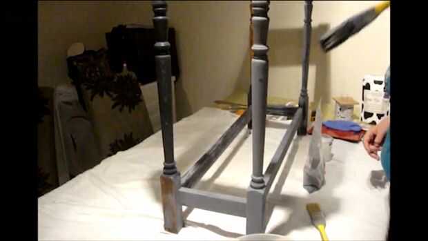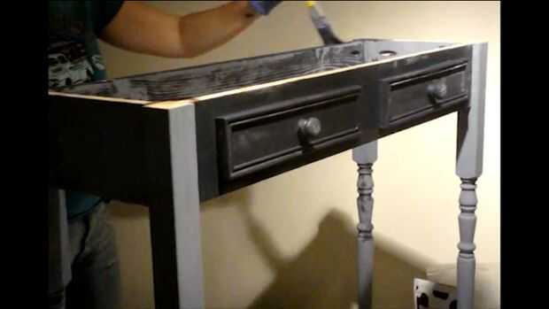 • A continuación mezcla la pintura de leche en polvo con agua tibia y aplica un color azul sobre el marco de la mesa de madera quemada.