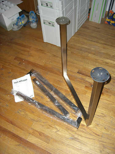 Las piernas son de Ikea. Creo que son para la expansión de una encimera. Hemos estado usando los de mi trabajo para construir escritorios para personas así que pensé que sería genial para esto también. Cuestan unos $30 cada uno así que no demasiado mal. Me gusta el contraste del metal a la madera natural.