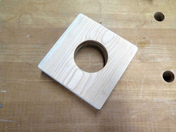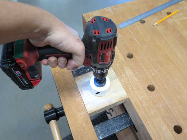 La botella es de 2 3/8" de diámetro en la base, así que uso un 2 1/2" agujero Sierra para darle un poco margen de maniobra. Abrazadera de su madera y Sierra a través del centro de la X.