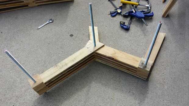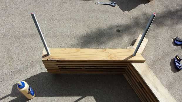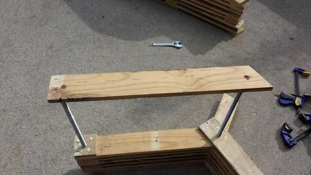 Como pegué cada pieza hacia abajo me Sujete cada tercer o cuarto lugar/asiento trasero pieza y espere hasta que el pegamento se ha secado antes de continuar. Después de que la silla se convirtió en más ancha que las abrazaderas, coloqué la arandela y pernos en el otro extremo de las varillas roscadas y esencialmente utilizado como abrazaderas, apretarlos para que se junte la madera.