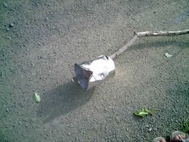3. clave la can en el extremo más pequeño de la vara, con al menos dos clavos en la dirección de la longitud de la vara, con las arandelas que sostienen el poder en el stick (todavía te funciona bien sin las arandelas).